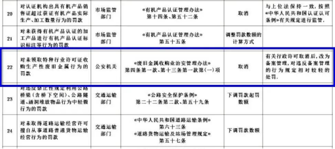 即:取消了“對未領(lǐng)取特種行業(yè)許可證收購生產(chǎn)性廢舊金屬的罰款”。該罰款設(shè)定依據(jù)為《廢舊金屬收購業(yè)治安管理辦法》第四條第一款、第十三條第一款第(一)項(xiàng)。罰款事項(xiàng)取消后的替代監(jiān)管措施:有關(guān)行政許可取消后,改為備案管理,對違反備案管理的行為規(guī)定相對較輕的處罰。