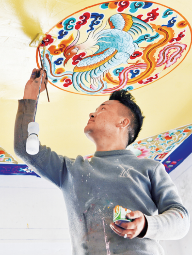 3月28日是西藏百萬(wàn)農(nóng)奴解放紀(jì)念日。在西藏自治區(qū)日喀則市南木林縣卡孜鄉(xiāng)湘河水庫(kù)移民新村,129戶(hù)、685人慶祝喜遷新居。位于南木林縣境內(nèi)的湘河水利樞紐及配套灌區(qū)工程是國(guó)務(wù)院確定的172項(xiàng)重大水利工程之一,也是改善環(huán)境、發(fā)展生產(chǎn)、提高群眾生活水平的民生工程。圖為2022年3月27日,來(lái)自日喀則的民間藝人在湘河水庫(kù)移民新村一處民居繪制屋頂。新華社記者張汝鋒/攝
