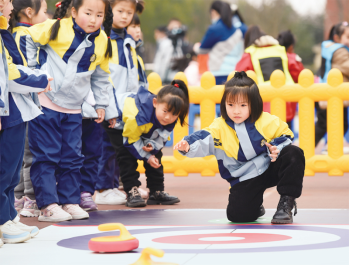 讓老百姓過(guò)上好日子,持續(xù)保障改善民生。圖為2022年2月16日,安徽省合肥市泰山路幼兒園的小朋友在開(kāi)學(xué)典禮上體驗(yàn)“旱地冰壺”游戲。新華社記者周牧/攝