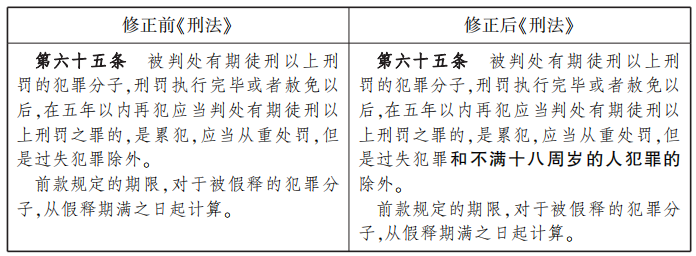 2011年5月1日起施行的《刑法修正案(八)》第六條對本條作了修改,增加了不滿十八周歲的人犯罪不構成累犯的規(guī)定。