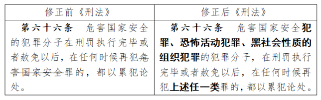 第六十六條 【特殊累犯】危害國家安全犯罪、恐怖活動犯罪、黑社會性質(zhì)的組織犯罪的犯罪分子,在刑罰執(zhí)行完畢或者赦免以后,在任何時候再犯上述任一類罪的,都以累犯論處。