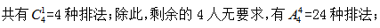 其次,丙在最后一個,共有1種排法;最后丁不在前三個,同時也不可能是最后一個,所以只有中間四個位置可以選擇,