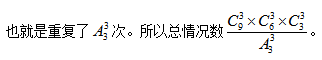 真有這么多種嗎?其實不然,根據(jù)上表來分析,這6種情況都是屬于同一種分組情況,即①②③一組,④⑤⑥一組,⑦⑧⑨一組。所以我們重復(fù)算了6次。