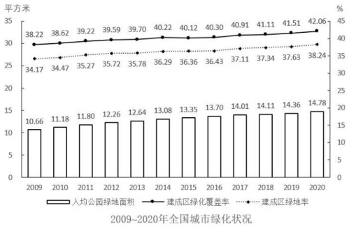 B.以2009年為基期計算,2009~2020年城市建成區(qū)綠地率年均上升0.4個百分點以上