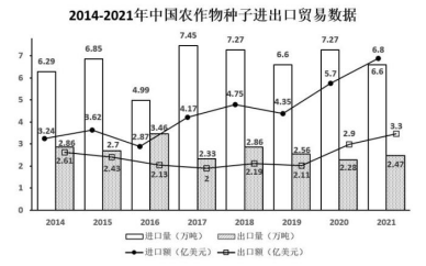 106.2014-2021年間,我國農(nóng)作物種子進出口貿(mào)易逆差超2億美元的年份有幾個?( )