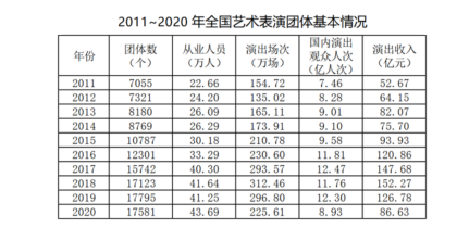 2020年末,全國(guó)共有藝術(shù)表演團(tuán)體17581個(gè),從業(yè)人員43.69萬人,其中各級(jí)文化和旅游部門所屬藝術(shù)表演團(tuán)體2060個(gè),從業(yè)人員10.75萬人。2020年,全國(guó)文化和旅游部門所屬藝術(shù)表演團(tuán)體共組織政府采購(gòu)公益演出13.38萬場(chǎng),比上年下降14.9%;觀眾0.86億人次,下降27.9%。