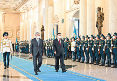 仲秋時(shí)節(jié)的努爾蘇丹,金風(fēng)送爽,云卷云舒。道路兩旁的旗桿上,鮮艷的五星紅旗高高飄揚(yáng)。習(xí)近平乘坐的國(guó)賓車隊(duì)在摩托車隊(duì)護(hù)衛(wèi)下抵達(dá)總統(tǒng)府。托卡耶夫總統(tǒng)在下車處熱情迎接。兩國(guó)元首共同步入總統(tǒng)府大廳。