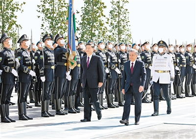 當(dāng)?shù)貢r間9月15日,國家主席習(xí)近平在撒馬爾罕同烏茲別克斯坦總統(tǒng)米爾濟(jì)約耶夫會談。會談前,米爾濟(jì)約耶夫為習(xí)近平舉行隆重歡迎儀式。新華社記者申宏攝