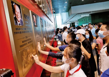 2020年全國(guó)科普日期間,為弘揚(yáng)科學(xué)家精神,中國(guó)科技館與國(guó)家科學(xué)技術(shù)獎(jiǎng)勵(lì)工作辦公室共同實(shí)施“國(guó)家最高科學(xué)技術(shù)獎(jiǎng)獲獎(jiǎng)科學(xué)家手?!表?xiàng)目,采集袁隆平、孫家棟、屠呦呦、黃旭華等國(guó)家最高科學(xué)技術(shù)獎(jiǎng)獲獎(jiǎng)科學(xué)家手模,并錄制寄語(yǔ)視頻。2022年5月,中國(guó)科技館被中國(guó)科協(xié)、教育部、科技部等7部門(mén)認(rèn)定為全國(guó)首批“科學(xué)家精神教育基地”。圖為在科學(xué)家“手模墻”前,觀眾們品讀科學(xué)家寄語(yǔ)并與科學(xué)家“擊掌”。中國(guó)科技館供圖