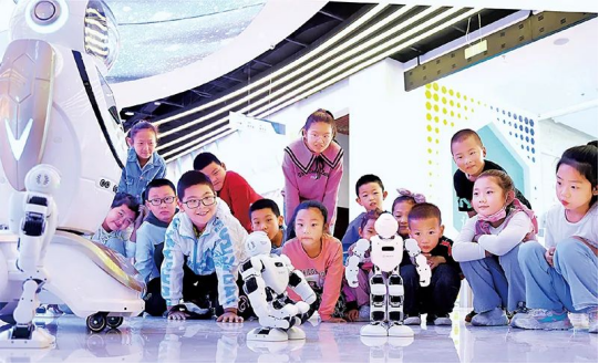 現(xiàn)代科技館體系服務(wù)范圍從城市居民為主拓展到全國(guó)城鄉(xiāng)居民、線上線下公眾,有效促進(jìn)了科學(xué)教育資源的均衡普惠。圖為2021年9月11日,甘肅省張掖市臨澤縣的小學(xué)生在張掖科技館觀看機(jī)器人表演。求是圖片王將/攝
