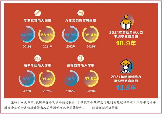 黨的十八大以來,我國教育普及水平快速提升。截至2021年,全國共有各級各類學(xué)校52.93萬所,在校生2.91億人,專任教師1844.37萬人。各級教育普及程度均達到或超過中高收入國家平均水平,其中,學(xué)前教育、義務(wù)教育普及程度達到世界高收入國家平均水平,高等教育進入國際公認的普及化階段,教育總體發(fā)展水平躍居世界中上行列。推進學(xué)前教育普及普惠,學(xué)前教育毛入園率達到88.1%,比2012年提高23.6個百分點。加快義務(wù)教育均衡發(fā)展和城鄉(xiāng)一體化,九年義務(wù)教育鞏固率達到95.4%,比2012年提高3.6個百分點。推進高中階段教育普及攻堅,高中階段毛入學(xué)率達到91.4%,比2012年提高6.4個百分點。推動高等教育內(nèi)涵式發(fā)展,高等教育毛入學(xué)率達到57.8%,比2012年提高27.8個百分點。教育普及的全方位躍升帶來人力資源開發(fā)水平顯著提升,我國勞動年齡人口平均受教育年限達到10.9年,新增勞動力平均受教育年限達到13.8年,擁有大學(xué)文化程度的人口超過2.18億,勞動力素質(zhì)結(jié)構(gòu)發(fā)生重大變化,全民族素質(zhì)極大提高。站在新的歷史起點上,我們要著力促進各級各類教育協(xié)調(diào)發(fā)展,在固根基、揚優(yōu)勢、補短板、強弱項上下功夫,持續(xù)擴大優(yōu)質(zhì)教育資源供給,不斷提升全民受教育程度。