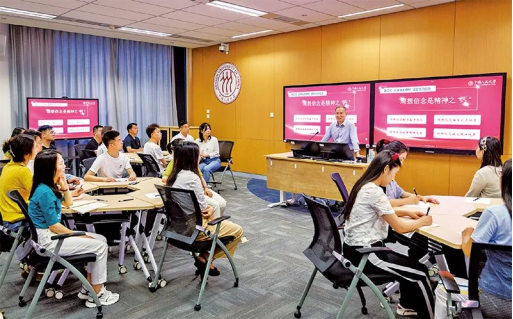 教育系統(tǒng)扎實推進習(xí)近平新時代中國特色社會主義思想進教材進課堂進頭腦,學(xué)校思想政治理論課改革創(chuàng)新成效顯著,“大思政課”建設(shè)全面推進。圖為2022年6月11日,中國人民大學(xué)“習(xí)近平新時代中國特色社會主義思想概論”課堂。中國人民大學(xué)供圖