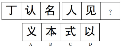 【答案】C【解析】觀察圖形特征,題干圖形均是漢字,整體看漢字雖然有相似部分,但是同中有異,可以先考慮疊加,觀察第一組,發(fā)現(xiàn)在第三個(gè)漢字中去掉了第一個(gè)與第二個(gè)相同的部分“同”,保留了前兩個(gè)漢字里不同的部分“氵”和“木”。所以規(guī)律為去同存異,因此第二組問號(hào)處應(yīng)為去掉相同部分“關(guān)”,保留“耳”和“阝”,可組成漢字“耶”。所以最后答案選擇到C。