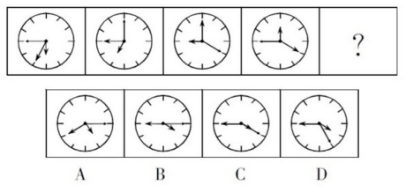 【答案】B【解析】從第一個(gè)圖形開始,最短的箭頭分別順時(shí)針旋轉(zhuǎn)1格、2格、3格、(4格),粗長(zhǎng)箭頭分別順時(shí)針旋轉(zhuǎn)2格、3格、4格、(5格),細(xì)長(zhǎng)箭頭分別順時(shí)針旋轉(zhuǎn)3格、4格、5格、(6格),得到后一個(gè)圖形,故選B。