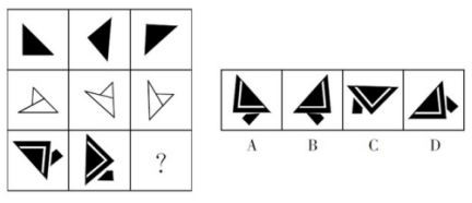 【答案】B【解析】通過觀察每一行的圖形的組成元素相似度都較高,前兩行圖形旋轉(zhuǎn)的方向都是順時(shí)針,并且旋轉(zhuǎn)的角度都是45度,那觀察第三行圖形的直角應(yīng)位于右下角,梯形在下面,故選B。