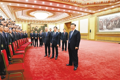 九月三十日,黨和國家領(lǐng)導(dǎo)人習(xí)近平、韓正等在北京人民大會堂會見C919大型客機(jī)項目團(tuán)隊代表并參觀項目成果展覽。這是習(xí)近平等會見C919大型客機(jī)項目團(tuán)隊代表。新華社記者丁林?jǐn)z