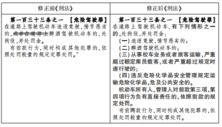 本條系2011年5月1日起施行的《刑法修正案(八)》第二十二條增設(shè)。2015年11月1日起施行的《刑法修正案(九)》第八條對本條作了修改,主要涉及如下兩個方面:一是增設(shè)行為方式,將“從事校車業(yè)務(wù)或者旅客運輸,嚴(yán)重超過額定乘員載客,或者嚴(yán)重超過規(guī)定時速行駛的”“違反危險化學(xué)品安全管理規(guī)定運輸危險化學(xué)品,危及公共安全的”規(guī)定為危險駕駛犯罪行為;二是明確機動車所有人、管理人對危險駕駛行為負(fù)有直接責(zé)任的,依照危險駕駛罪的規(guī)定追究刑事責(zé)任。