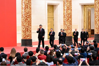 剛剛在二十屆一中全會上當(dāng)選的中共中央總書記習(xí)近平和中共中央政治局常委首次集體亮相,同采訪二十大的中外記者親切見面。