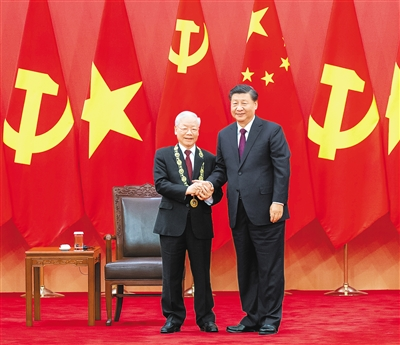 習近平發(fā)表講話。習近平指出,阮富仲總書記是堅定的馬克思主義者,是中國共產(chǎn)黨的親密同志和真誠朋友。在阮富仲總書記高度重視和親自推動下,中越兩黨兩國傳統(tǒng)友誼得到鞏固,政治互信不斷增強,務實合作持續(xù)深化,交流互鑒日益密切。“友誼勛章”代表了中國共產(chǎn)黨和中國人民對阮富仲總書記和越南人民的友好感情,象征著中越“同志加兄弟”的深厚情誼,蘊含著兩黨和兩國人民共同追求美好未來的殷切希望。