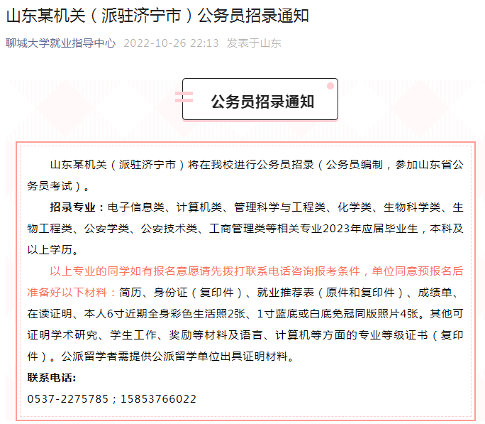 2023年山東省考又出新消息了:山東某機關(guān)(派駐濟(jì)寧市)將在聊城大學(xué)進(jìn)行公務(wù)員招錄!具體如下: