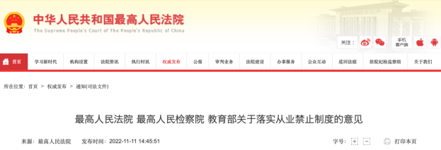11月11日,最高人民法院會同最高人民檢察院、教育部發(fā)布《關(guān)于落實從業(yè)禁止制度的意見》。全文共10條,內(nèi)容如下: