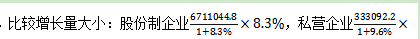 例3:2014年規(guī)模以上股份制企業(yè)主營業(yè)務(wù)收入671104.8億元,同比增長8.3%;私營企業(yè)主營業(yè)務(wù)收入333092.2億元;同比增長9.6%。