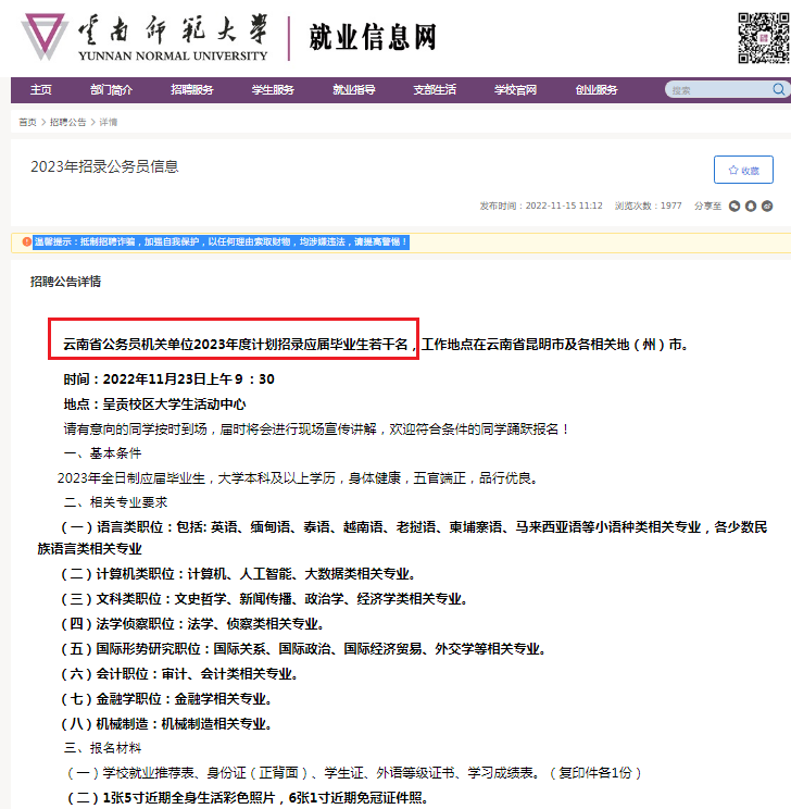 近日,云南師范大學(xué)就業(yè)信息網(wǎng)發(fā)布的一則“2023年招錄公務(wù)員信息”,是關(guān)于云南省公務(wù)員2023年度招錄應(yīng)屆畢業(yè)生計(jì)劃。詳情如下: