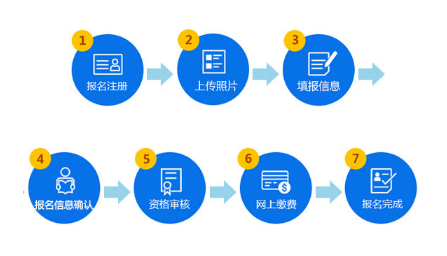 報名注冊 → 上傳照片 → 填報信息 → 報名信息確認(rèn) → 資格審核 → 網(wǎng)上繳費(fèi) → 報名完成。