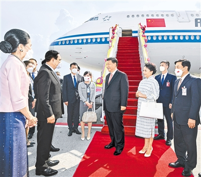 習近平和夫人彭麗媛乘坐的專機抵達曼谷素萬那普國際機場時,泰國總理巴育夫婦、副總理兼外長敦夫婦、文化部部長伊提蓬夫婦等熱情迎接。禮兵分列紅地毯兩側,身著靚麗民族服裝的當地青年行合十禮夾道歡迎,泰國華僑華人代表揮舞中泰兩國國旗,向習近平夫婦表示最熱烈的歡迎。