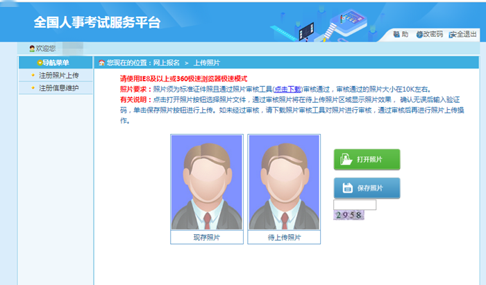 進(jìn)入登錄界面,首次登錄系統(tǒng)需要上傳照片,系統(tǒng)只能上傳通過(guò)中國(guó)人事考試網(wǎng)發(fā)布的照片處理工具(http://download.people.com.cn/zhaopianshenhe.rar)處理后的照片,點(diǎn)擊“打開(kāi)照片”按鈕選擇要上傳的照片,輸入驗(yàn)證碼,點(diǎn)擊“保存照片”,上傳成功后跳轉(zhuǎn)到照片確認(rèn)頁(yè)面,核對(duì)照片無(wú)誤后點(diǎn)擊“確定”。