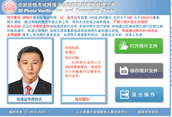1.照片處理工具是對(duì)報(bào)考者所需上傳照片進(jìn)行標(biāo)準(zhǔn)化處理的專(zhuān)用照片處理軟件。照片上傳之前均須通過(guò)“照片處理工具”進(jìn)行處理、保存,否則無(wú)法完成照片上傳和后續(xù)相關(guān)操作。源照片要求:報(bào)考者本人近期免冠正面電子證件照片(藍(lán)底或白底證件照,JPG或JPEG格式,照片寬度不低于295像素,高度不低于413像素)。