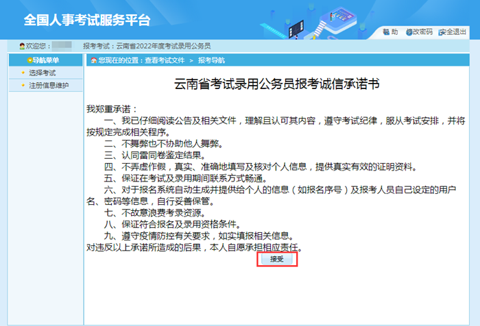 報(bào)考者登錄后,閱讀“報(bào)考須知”頁(yè)面,閱讀完“報(bào)考須知”后點(diǎn)擊“接受”后進(jìn)入“報(bào)考者承諾書(shū)”,閱讀并接受“報(bào)考者承諾書(shū)”后進(jìn)入“填寫(xiě)個(gè)人信息”。