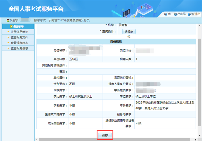 個(gè)人信息填寫(xiě)完成,點(diǎn)擊“保存”后保存?zhèn)€人信息,如個(gè)人信息填寫(xiě)錯(cuò)誤,點(diǎn)擊“查看報(bào)考狀態(tài)”“信息維護(hù)”按鈕進(jìn)行修改。