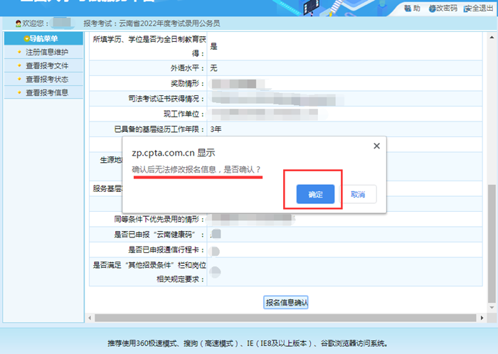 1.只有在“報(bào)名信息確認(rèn)”頁(yè)面點(diǎn)擊“確認(rèn)”按鈕后,才將個(gè)人報(bào)考信息提交至招考部門(mén),如未完成“報(bào)名信息確認(rèn)”操作,報(bào)名過(guò)程未全部完成,招考部門(mén)將無(wú)法看到報(bào)考者信息,無(wú)法進(jìn)行資格審查。