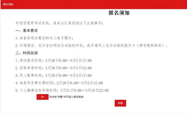 登錄后考生會看到本次考試的報名須知,仔細閱讀須知信息,點擊同意進入到報考界面。