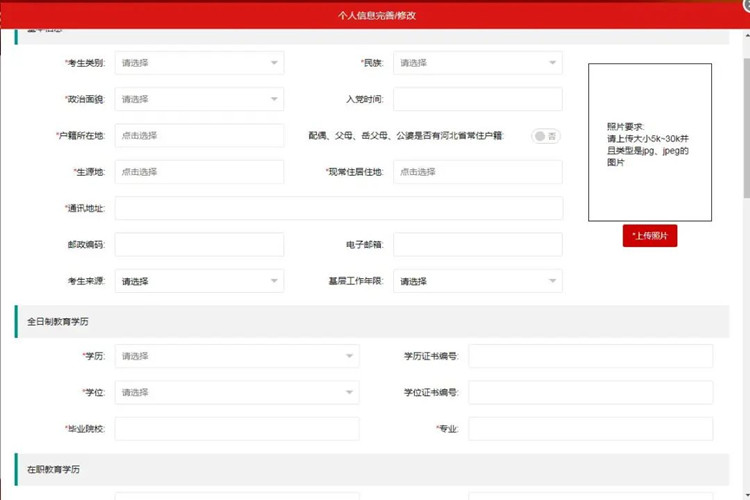 基本信息的填寫。*號為必填項,同時報考考生需要注意照片要求:請上傳大小15kb以內(nèi)并且類型是jpg、jpeg的圖片。