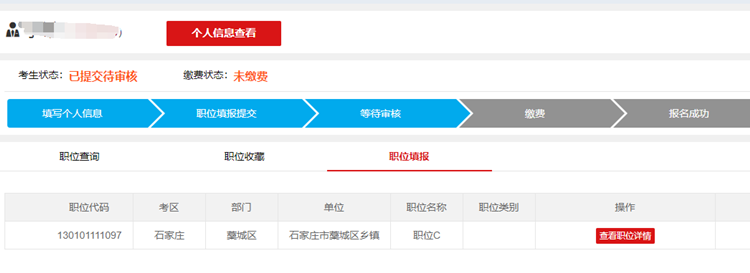 填報成功后進行報考誠信承諾書的認真閱讀并進行報考職位的核對,確定報名信息后進入等待審核狀態(tài),如審核不通過則需根據(jù)招考單位寫出的審核理由返回修改完善個人信息或更改報考職位。