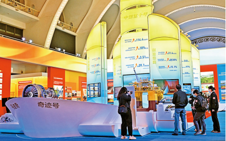 黨的十八大以來,以習(xí)近平同志為核心的黨中央提出并貫徹新發(fā)展理念,著力推進(jìn)高質(zhì)量發(fā)展,推動構(gòu)建新發(fā)展格局,實施供給側(cè)結(jié)構(gòu)性改革,制定一系列具有全局性意義的區(qū)域重大戰(zhàn)略,我國經(jīng)濟(jì)實力實現(xiàn)歷史性躍升。圖為2022年10月8日,觀眾在“奮進(jìn)新時代”主題成就展中央綜合展區(qū)內(nèi)參觀拍攝中國經(jīng)濟(jì)“奇跡號”巨輪模型。新華社記者李鑫/攝