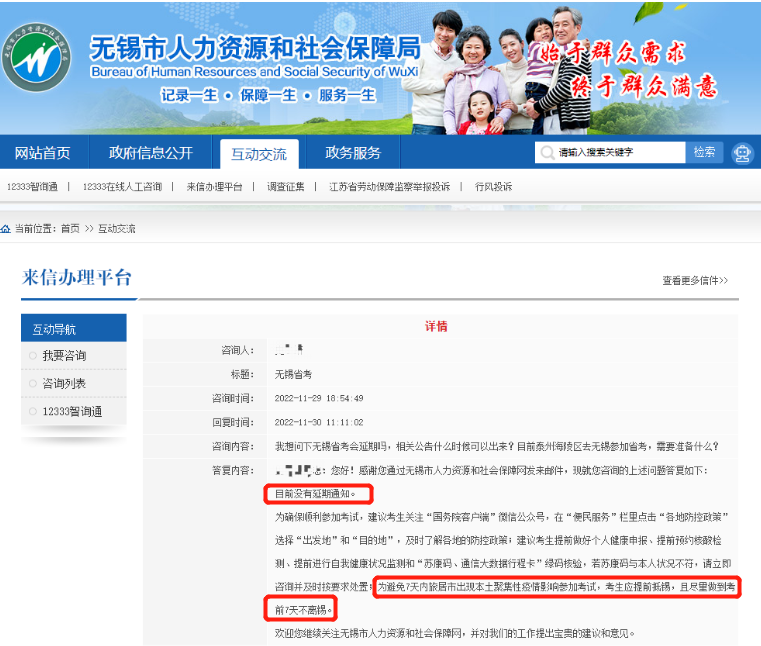 有考生在無錫人社局官網(wǎng)進(jìn)行了咨詢,官方回復(fù)稱:目前沒有延期通知。同時(shí)建議考生為避免7天內(nèi)旅居市出現(xiàn)本土聚集性疫情影響參加考試,考生應(yīng)提前抵錫,且盡量做到考前7天不離錫。