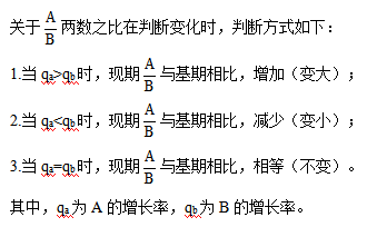 形式的列式我們統(tǒng)稱為兩數之比,??嫉挠斜戎?、平均數以及倍數,還有收入利潤率、產銷率等等。當我們已知分子分母的增長率的大小關系時,就可以直接判斷現期兩數之比與基期兩數之比相比較的變化情況。