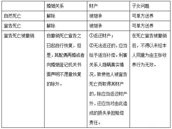 2.死亡宣告的撤銷:被宣告死亡的人重新出現(xiàn),經(jīng)本人或者利害關(guān)系人申請,人民法院應(yīng)當(dāng)撤銷死亡宣告。