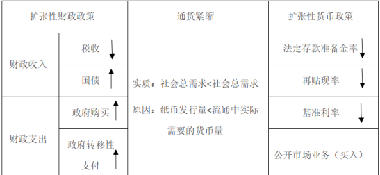 以上就是在通貨緊縮下,我國(guó)采取的擴(kuò)張性財(cái)政政策和擴(kuò)張性貨幣政策,通貨膨脹則相反,故不再贅述。