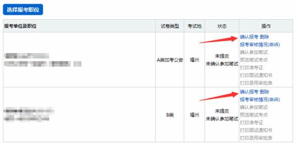在已選擇職位列表中,選擇擬報(bào)考職位,并點(diǎn)擊“確認(rèn)報(bào)考”按鈕。