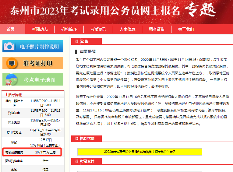 不過,近日泰州市的公務(wù)員錄用專題中關(guān)于筆試成績查詢的時(shí)間已經(jīng)從1月中旬改為了1月上旬,如下圖所示: