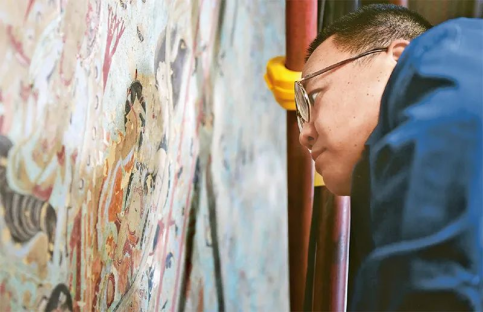 加大文物和文化遺產保護力度,提高傳承實踐能力。圖為2022年4月19日,在莫高窟第231窟,敦煌研究院文物保護技術服務中心的壁畫修復工作者在修復出現病害的壁畫。新華社記者杜哲宇/攝