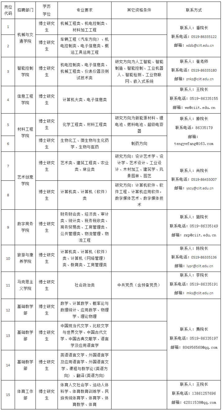 請(qǐng)應(yīng)聘者填寫《常州工業(yè)職業(yè)技術(shù)學(xué)院公開招聘人員報(bào)名表》(見附件),并發(fā)送至各招聘部門郵箱或人事處郵箱zhaopin@ciit.edu.cn。發(fā)送郵件主題格式:崗位代碼+招聘部門+姓名+專業(yè)+學(xué)歷學(xué)位。