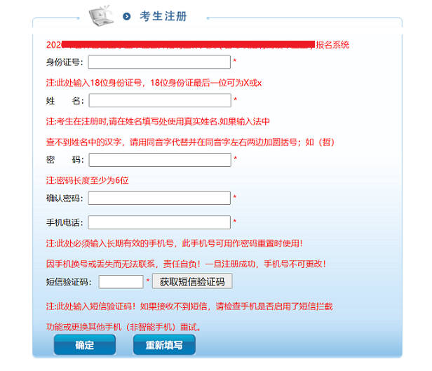 未注冊考生請注冊后再登錄,點(diǎn)擊圖1-4中的‘注冊新用戶’進(jìn)入注冊頁面如圖1-5,請考生按提示填寫注冊信息。點(diǎn)擊‘確定’提交注冊信息,注冊成功后將返回圖1-4頁面進(jìn)行登錄(返回登陸時自動把身份證號填充到身份證號文本框內(nèi))。