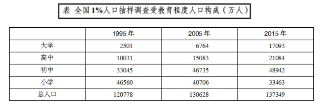 【例2】2005年全國1%人口抽樣調(diào)查主要數(shù)據(jù)公報顯示,同2000年第五次全國人口普查相比,2005年具有大學教育程度的人口增加2193萬人;具有高中教育程度的人口增加974萬人具有初中教育程度的人口增加3746萬人;具有小學教育程度的人口減少4485萬人。2015年全國1%人口抽樣調(diào)查主要數(shù)據(jù)公報顯示,同2010年第六次全國人口普查相比,2015年每10萬人中具有大學教育程度人口由8930人上升為12445人;具有高中教育程度人口由14032人上升為15350人;具有初中教育程度人口由38788人下降為35633人;具有小學教育程度人口由26779人下降為24356人。