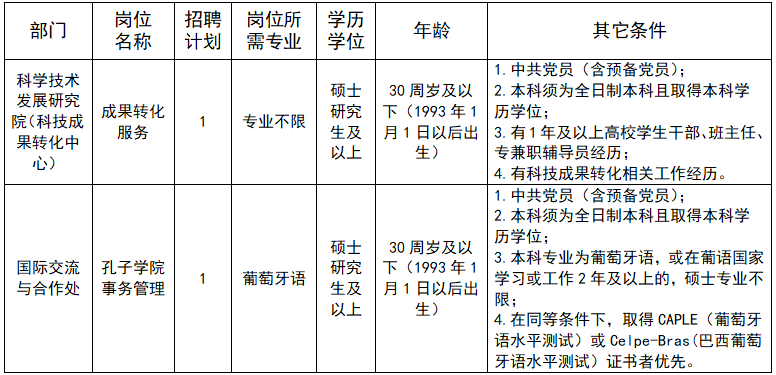 根據(jù)學(xué)校事業(yè)發(fā)展需要,現(xiàn)面向社會公開招聘管理崗位工作人員2人,其中科學(xué)技術(shù)發(fā)展研究院(科技成果轉(zhuǎn)化中心)1人、國際交流與合作處1人。