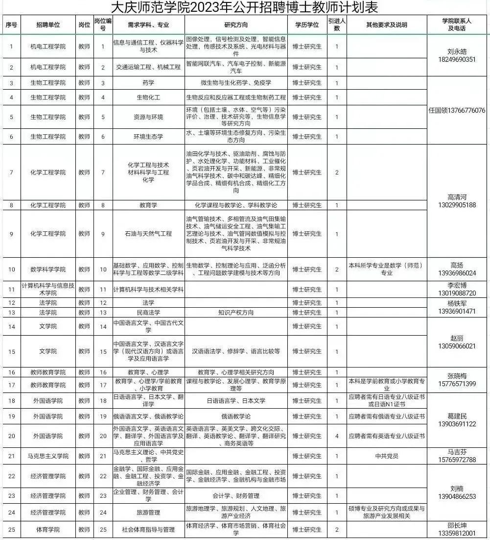 詳見《大慶師范學(xué)院2023年公開招聘博士教師計劃表》(附件1)。